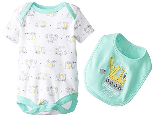 Love this matching set. Nice that it comes with a bib instead of the matching hat like normal. My husband is a crane operator and was thrilled when the baby got an outfit that goes with his profession. What's not to love about a baby in turquoise anyway?!